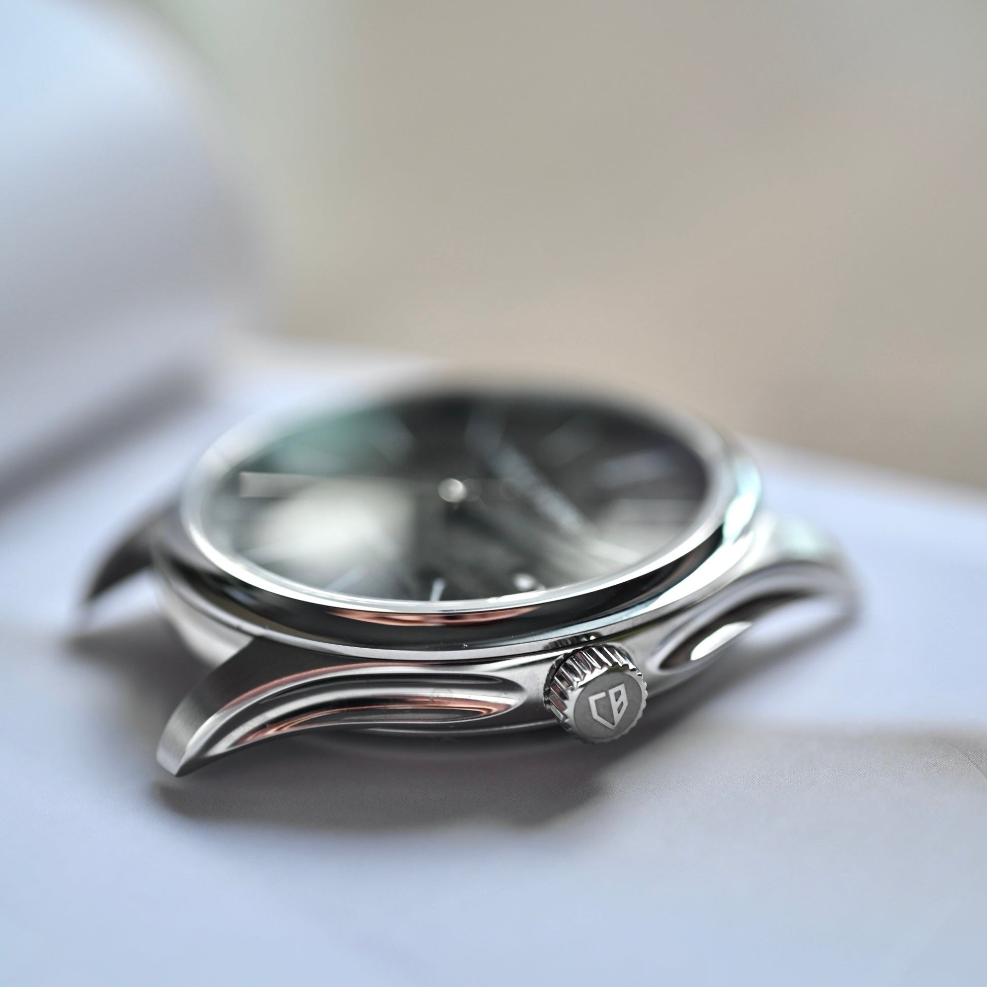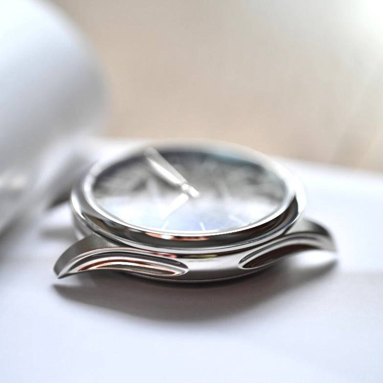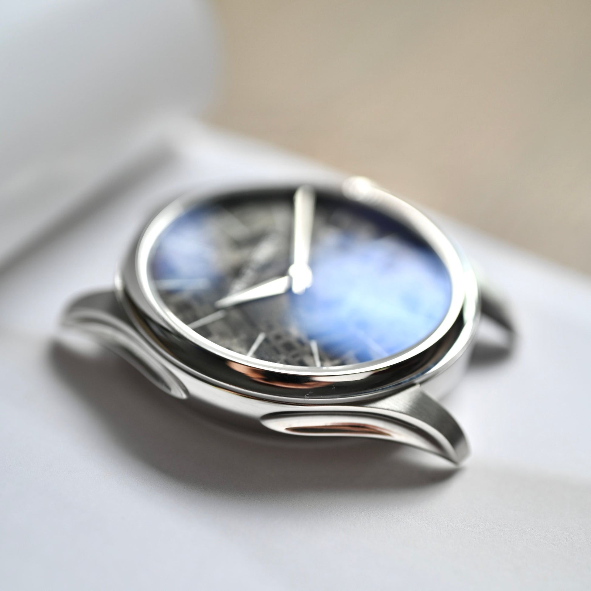 Asteria is a combination of sleek metallic shine and the mysterious meteor glow. The cave-in sides of Asteria took inspiration from the spaceship. Adorned in an elegant onyx black porcelain dial and visible through a display caseback, Asteria's Swiss-made movement with a solid tungsten rotor transcends its functional purpose and exudes unparalleled aesthetic charm.