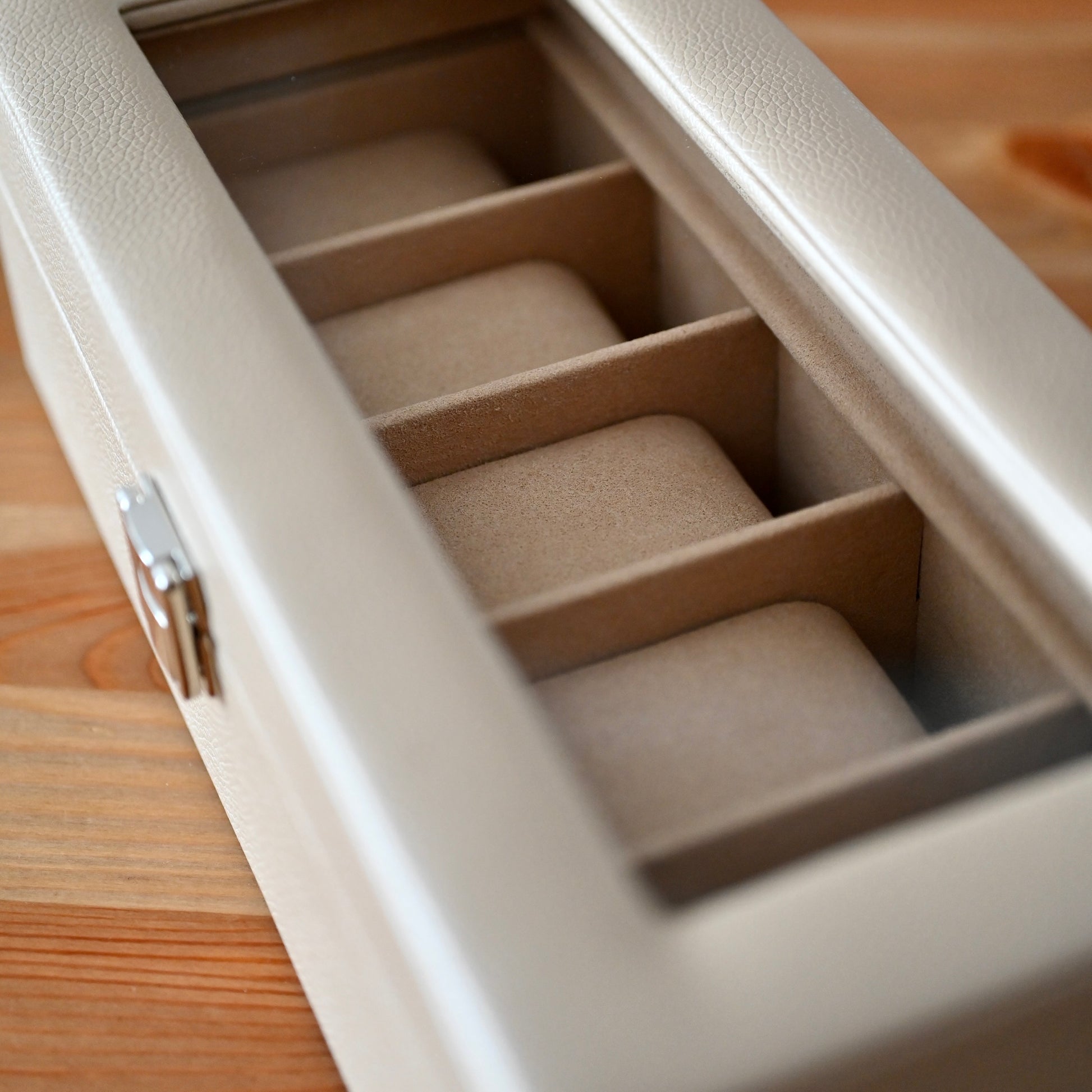 This premium Khaki Leather Watchbox from Charles Berret features 5 watch compartments and is uniquely made to protect your favourite timepiece while adding sophistication and elegance to your collection.