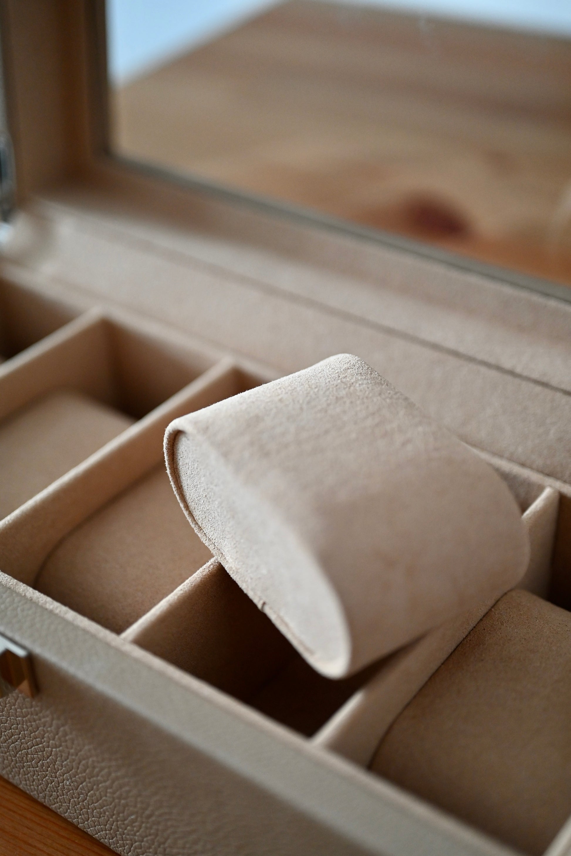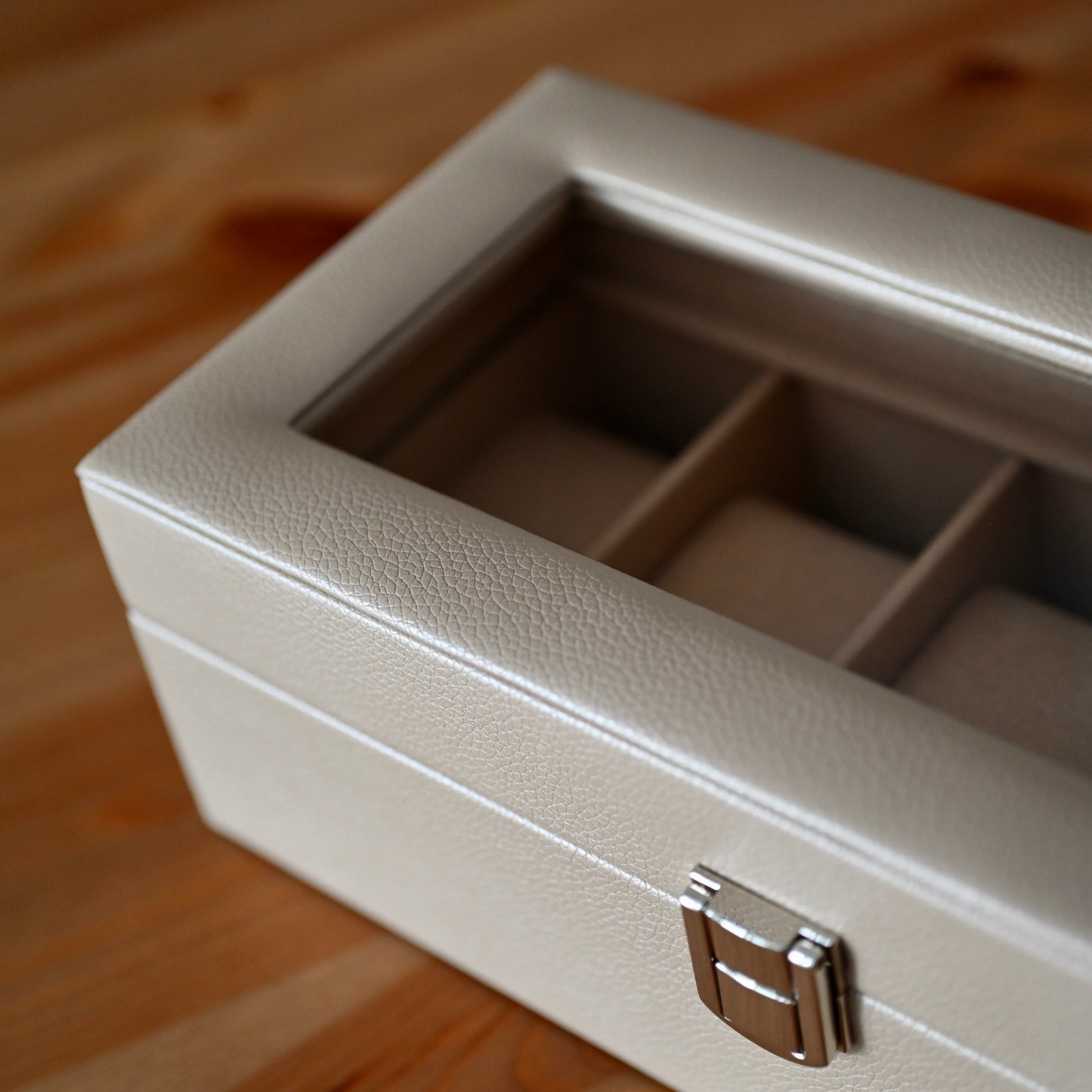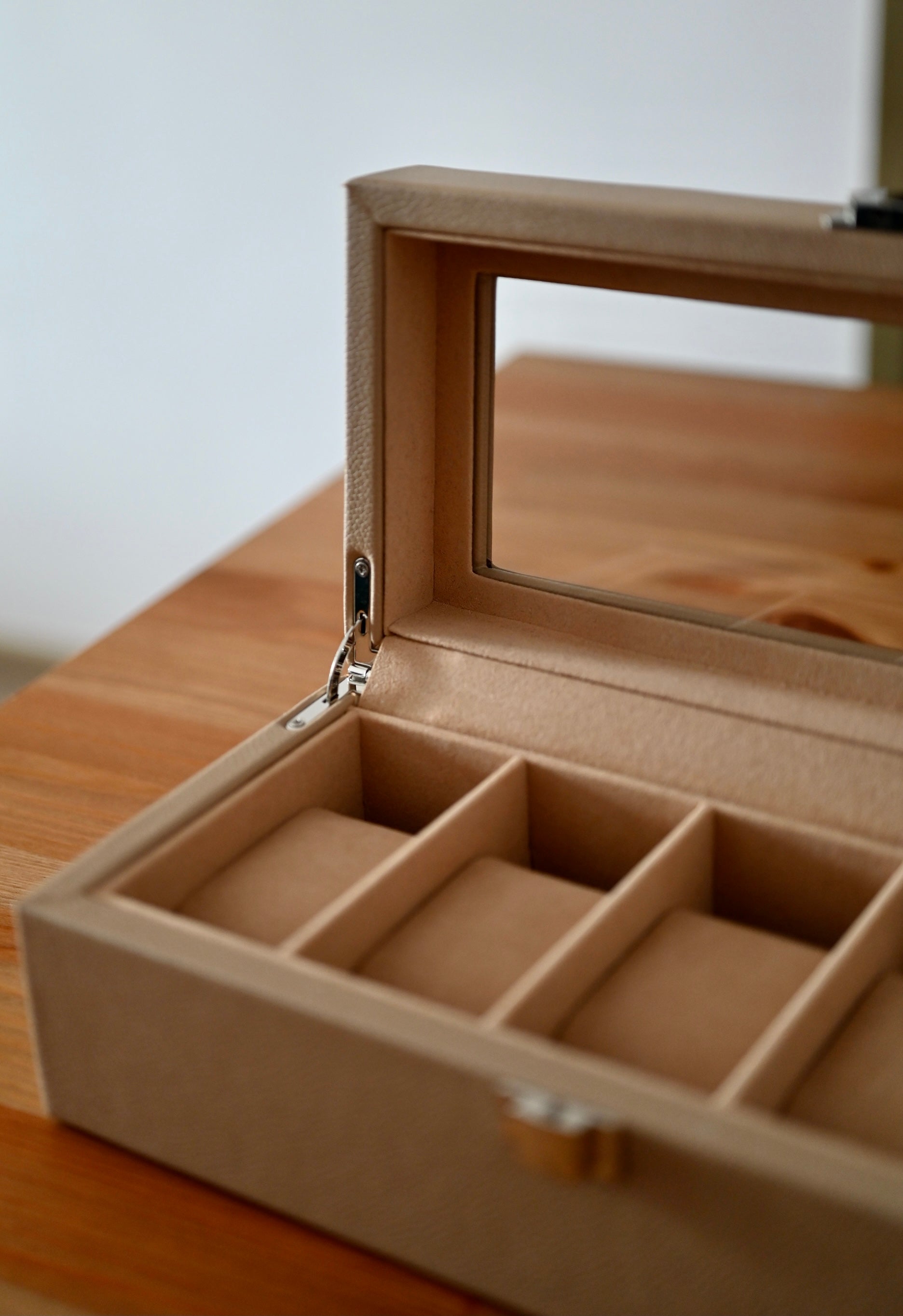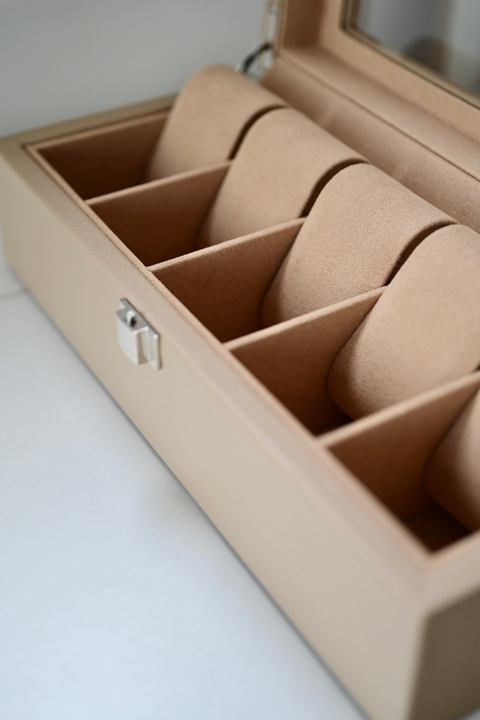 The premium khaki leather, suede interior and glass top make this watchbox more contemporary and versatile.